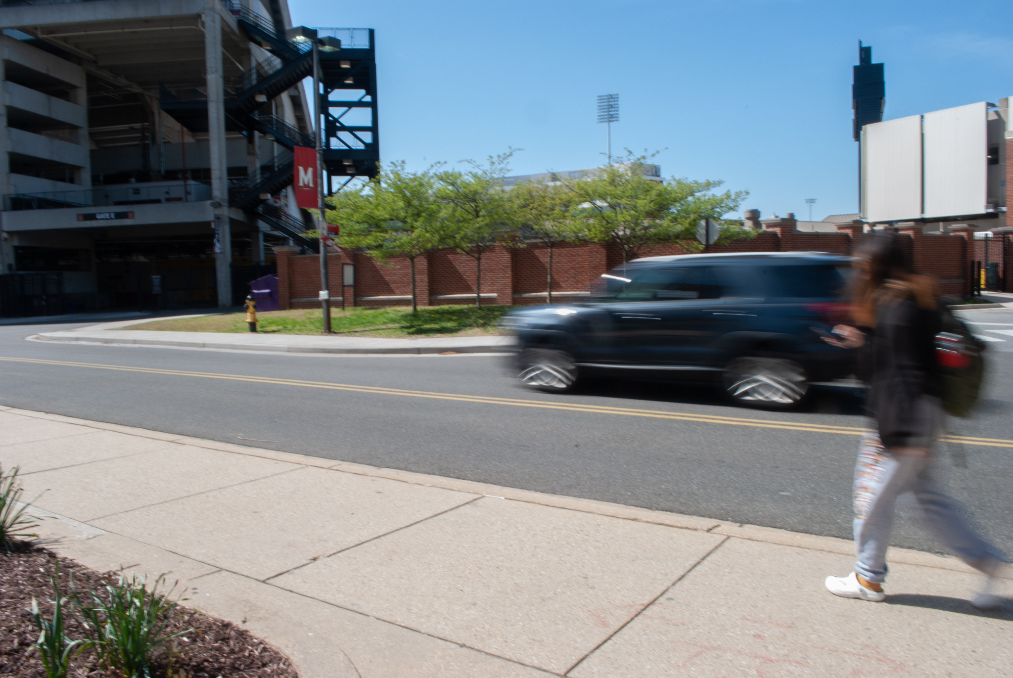 A student walks parallel to the street in College Park, Md. on April 20, 2022.